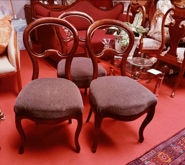 3er Set Vintage French Country Provincial Ballonrücken Stühle mit klassisch melliertem Bezug in grau-braun Tönen. Elegante stilvolle Holzstühle, Polsterung und Bezug in gutem Zustand.