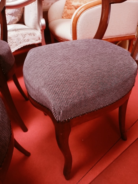Von diesen italienischen Stilstühlen haben wir 2 Sets, die bei einem Neubezug perfekt kombiniert werden können. Wir haben 8 Stück ohne Armlehne und 2 Stück mit Armlehne.