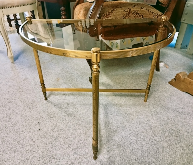 Vintage Messing Tisch mit Glasplatte, Halbmonform, Beistelltisch. Breite: 60 cm, Höhe: 46,5 cm, Maximale Tiefe: 38 cm. Kaufpreis: 40,- €