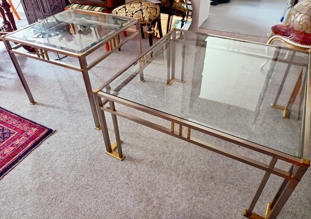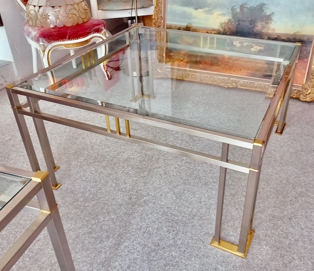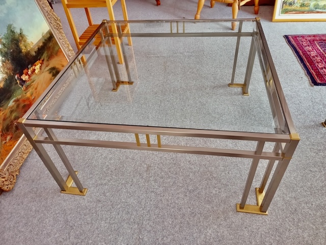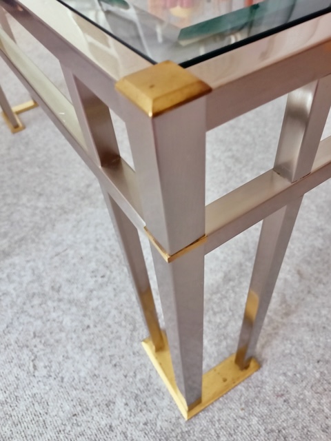 Eleganter formschöner Tisch, Metallrahmen und Glasplatte.