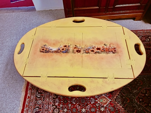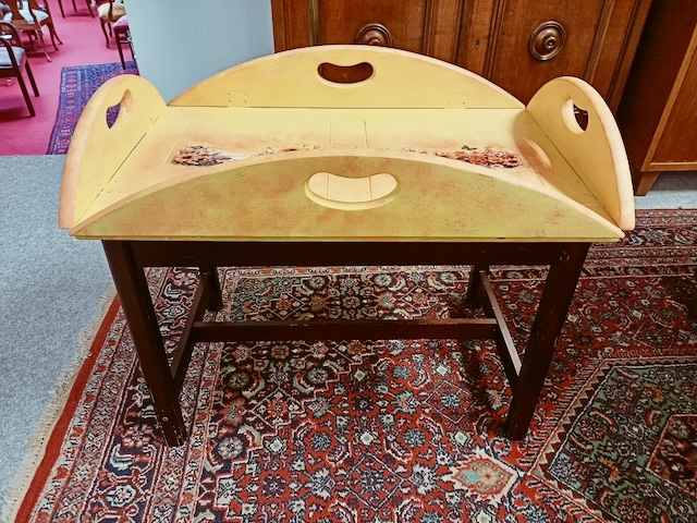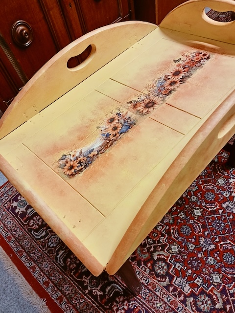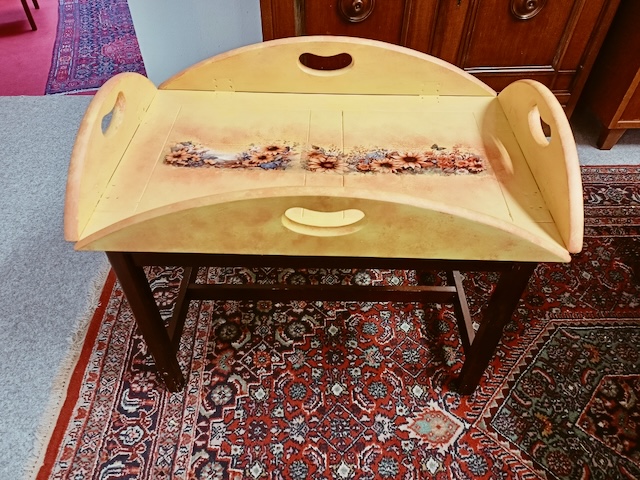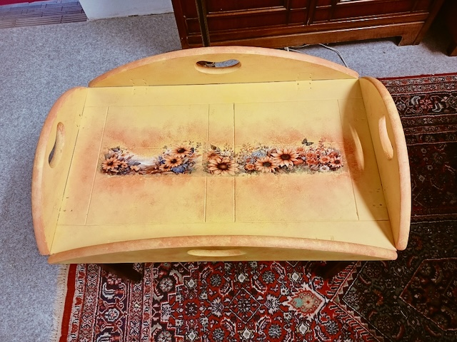 Tablett Tisch. Tisch Gestell mit Tablett Aufsatz, Tablett dann platt klappbar. Tablett komplett generalüberholt in neuem Design. Tischgestell in braun im Ursprungszustand.