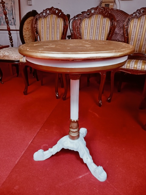 Fuß aus Metall in weiß und gold lackiert, Tischplatte Massivholz.