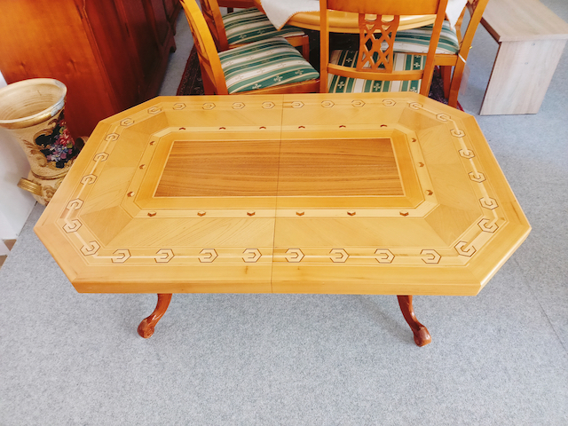 Sehr schöner Wohnzimmertisch mit eleganten Intarsien in Top Zustand. Ästhetischer Fuß mit gefälligen Formen. Breite: 119 cm, H: 57 cm, Tiefe: 79 cm. Kaufpreis: 180,- €