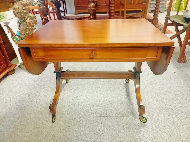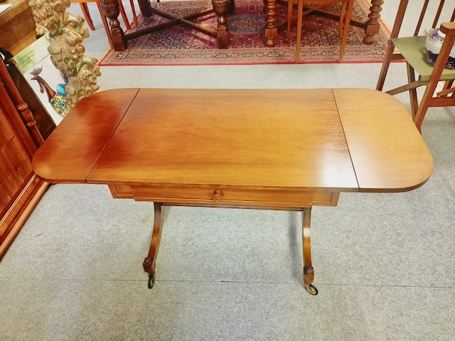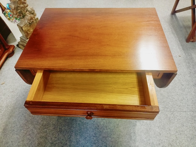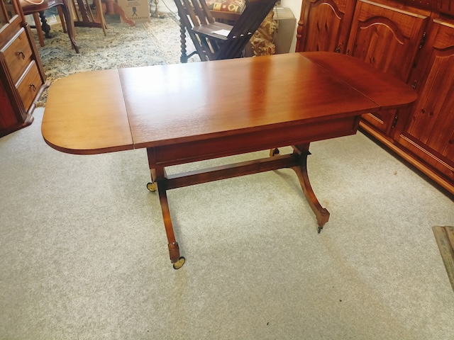 Kleiner aber feiner Tisch mit Verlängerung zum ausklappen und Rollen an den Füßen.