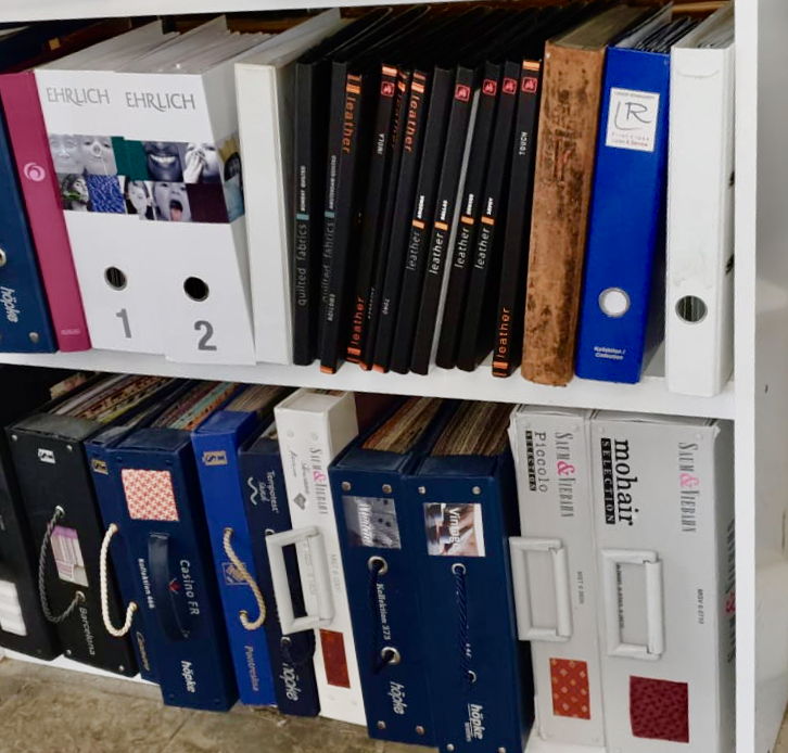 Vielleicht finden Sie ja auch gleich etwas in unseren Schränken. Hier bewahren wir Stoffe auf, die wir vorrätig haben, oder auch Reststücke, die wir zu reduzierten Preisen anbieten.