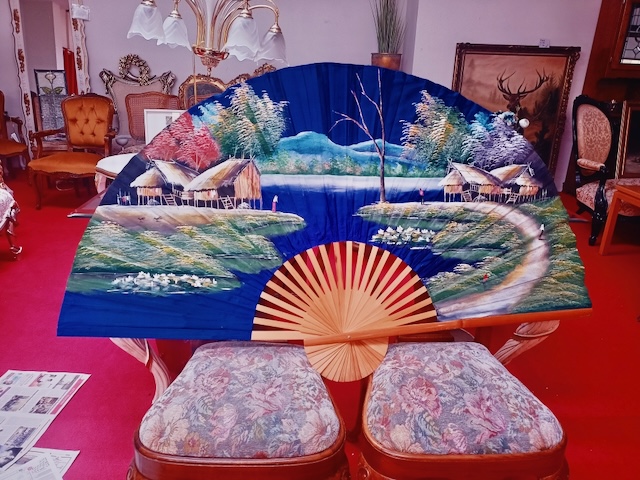 Großer dekorativer Wandfächer mit Landschaftsbild, B: 154 cm, H: 88 cm. Kaufpreis: 30,- €