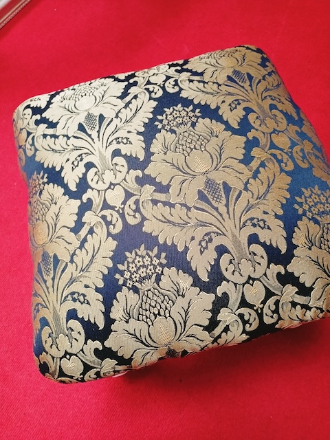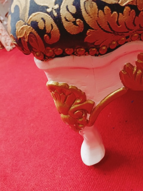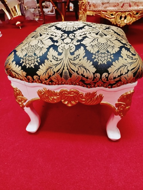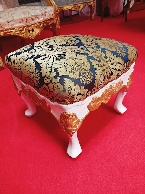 Kleiner Barocker Hocker in weiß und Gold. handgefertigt aus massivem Holz. Stoff ein Barocker Damast. Neuwertiger Zustand, unbenutzt, nur gelagert. Maße: 40 X 40 cm, Höhe 34 cm.